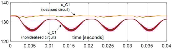 Steady state waveforms of voltage on the C1 DC-link capacitor in idealized case (Rdson ≈ 0 and VF ≈ 0), and nonidealized case (∑Rdson ≈ 100 mΩ and VF ≈ 1.5 V for each diode).