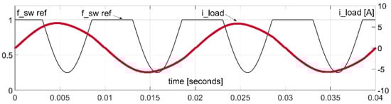 As can be observed in Figure 7, the DC source current (isource) has an AC component at double frequency of the output voltage. In order to reduce this component from the source’s current, a method for additional control of the AIVB’s operation was introduced. The concept is based on the switching frequency of the AIVB variations (fsw = var) which affects the amount of energy transferred from the C2 to C1 and C3 DC-link capacitors. The method of the reference generation for the switching frequency of the AIVB (fsw_ref) is based on the concept presented in Figure 4. It is composed of sinusoidal signal with amplitude of 0.65 positive biased by 0.1, limited to maximum value of 1 and phase shifted by 2π/3 [rad] (Figure 12). Such a reference for the AIVB’s control has been developed by the simulation study where a sweep of bias and phase shift has been performed, seeking the best double frequency reduction.