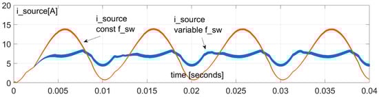 The DC source current in the case of operation of the AIVB with constant switching frequency and variable frequency according to the reference presented in Figure 12.