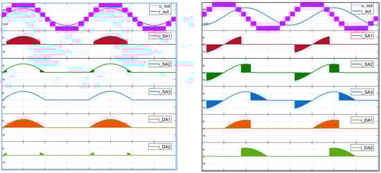 The current stress of the inverter switches depends here on the modulation index (ma) and the output power value as well as its character. Additionally, the number of switching operations of devices varies versus ma, Pout, and Qout. Figure 18 presents the simulation results of such comparison and the chart with the dependency of the current load of switches and diodes versus the modulation index and power. From these results (Figure 18) it is seen that for operation with the active power and high ma, the current value of switches is nearly the same in all devices and the inequality of current stress is seen among the diodes. Under the determined range of ma, Pout, and Qout, the thermal design requirements can be estimated.