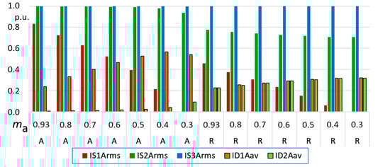 Current load of the inverter switches S1A, S2A, S3A, and diodes D1A and D2A under the operation with pure active (A) and reactive power (R), as well as an impact of the modulation index. By symmetry, values of currents of other switches corresponds to the presented data.