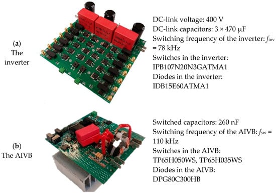 The experimental tests were performed with the converters and setup described in Figure 20. The experiment was prepared to confirm the correctness of the concept of the system configuration and control. The system is composed of two converters and two methods of the input power control were verified as well. To implement the single-phase inverter at 400 V on DC-link, the MOSFET with VDS = 200 V and low on-state resistance were used. The AIVB was designed as a GaN based converter to minimize Coss losses, since operating in ZCS mode transistors of the AIVB are turned-on when their output capacitance is charged. A typical drain to source voltage VDSS = 650 V allows to avoid overvoltage failure in the tested AIVB circuit.