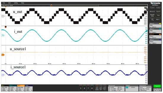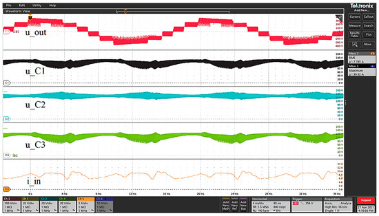 Using the setup configured according to Figure 5a, where the voltage on each DC-link capacitor is supplied by an independent DC power supply, the seven-level inverter with the PD-PWM was verified. Figure 21 presents the waveforms of the inverter operating with Pout = 982 and the measurements of particular input powers with the values: PC1 = 255 W, PC3 = 251 W, and PC2 = 521 W. This means that over 50% of the power can be converted to the AC side directly from the source which is connected to the C2 (Figure 1) and 50% of energy will be converted by the boost stage in the system with the AIVB.