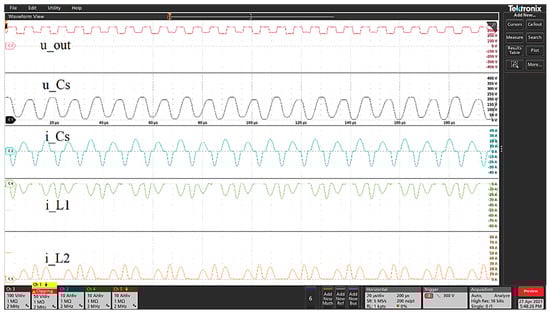 Operation of the AIVB with constant switching frequency. Waveforms of the output voltage of the inverter (uout [100 V/div]), voltage and current of the switched capacitor (uCs [50 V/div], iCs [10 A/div]) as well as currents of resonant chokes (iL1 [10 A/div], iL2 [10 A/div]).
