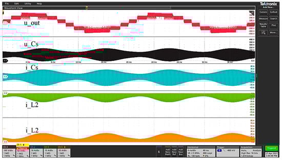 AIVB operation with variable frequency. Steady state waveforms of voltages and currents of DC-link capacitors of the seven-level inverter with three input voltage sources. 500 μs/div. Pout = 1 kW, Lf = 6 μH.