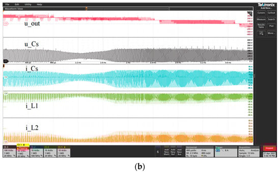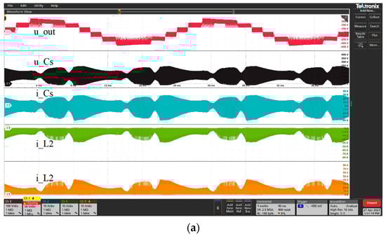 Operation of the DC-AC converter in the case of controlled switching frequency of the AIVB. Waveforms of the output voltage of the inverter (uout [100 V/div]), and voltage and current of the switched capacitor (uCs [50 V/div], iCs [10 A/div]), as well as currents of resonant chokes (iL1 [10 A/div], iL2 [10 A/div]). Waveforms’ time span: 40 ms (a) and 4 ms (b).