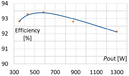 For the demonstrated implementation of the converter (Figure 20), the overall efficiency results are presented in Figure 27.