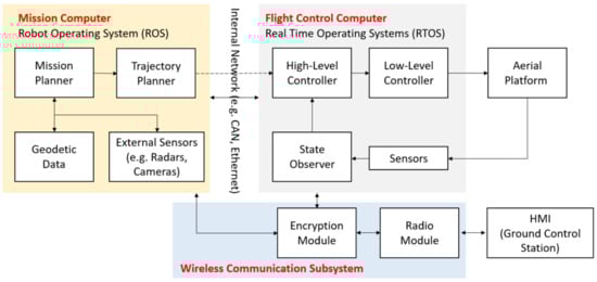 In many works, where an additional computer is used, which acts as a calculation unit, e.g., to navigate obstacles, modify flight paths, and other additional functions, ROS (Robot Operating System) is used. In the work of Yu et al. [12], a commercial UAV was used, which was connected to a computer based on ROS to control the UAV using predefined human gestures. A similar approach was presented by Carvalho et al. [13], where the PX4—FCC open-source autopilot was combined with a computer with Linux and ROS. In addition, ROS is often used for prototyping mission planning algorithms and testing them in a virtual 3D environment (Zhang et al. [14]). Having analyzed the abovementioned works, it can be concluded that the vast majority of them use ROS for an additional/external computer. The FCC is responsible for the basic functions of stabilization and control and is able to operate independently of the mission computer that plays a supporting role. Communication between FCC and MC uses network interfaces equipped with a sensor system. Such a connection shall allow direct access to data of both FCC and MC.