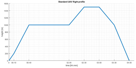 The high-level controller shall find and deliver signals to efficient attitude and altitude UAV control, including the propulsion system on the basis of the values set and appointed by the state observer so that the vehicle achieves the preset flight parameters. At this point, it is worth noting that UAVs are specific aerial vehicles with a low altitude variation profile. This implies that the change in altitude is linked to high energy expenditure, which is not recommended for vehicles of this type. An example flight profile is shown in Figure 2.