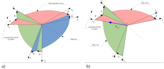 To describe the forces and moments affecting UAVs, frames of reference compliant with PN-ISO 1151 (flight dynamics—concepts, quantities, and symbols) and markings from [PN-ISO 1151] have been adopted. Coordinate systems (Figure 5a,b) are described as follows: