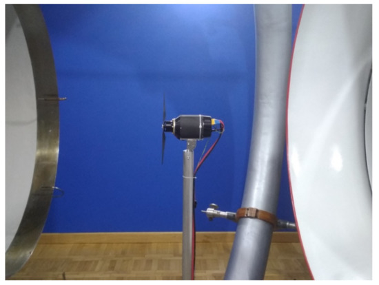 According to the above relationships, generated forces and moments strongly depend on aerodynamic speed. Therefore, wind and turbulence parameters have a significant impact on the energy demands for a flight with desired parameters. In addition, the above relations show that if the wind strength will generate too big a drag force, there may be a situation where the aeroplane is unable to generate enough thrust that will enable the UAV to move in the intended direction. In this article, the UAV is equipped with a drive set based on a BLDC electric motor and a two-blade propeller. The drive set is located in the rear part of the UAV.