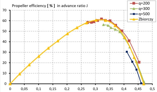 The tests were performed for three dynamic pressure values, q = 200 Pa, q = 300 Pa, and q = 500 Pa, at three angular settings of the drive unit 90°, 30°, and 15°. The dynamic pressures were 18.2 m/s, 22.2 m/s, and 28.7 m/s, respectively. Characteristics were determined using a laboratory station for measurement of the drive unit specially designed and developed as part of the project. The drive unit measurements performed for the angle of inclination 90° (inflow direction in accordance with the axis of the propeller shaft) provided the data necessary to determine the characteristics of the propeller:
