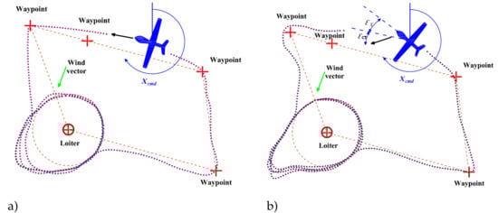 A further simulation was carried out to verify the operation of the roll angle limitation algorithm to the SAR mission. Figure 20a shows the flight trajectory without the roll limitation. Presented results show that, despite disturbances in the form of wind, UAV operates the route according to the defined path. However, in the case of a flight with a roll angle limited to 5 degrees for the SAR mission, the UAV will continue to attempt to follow the set path (see Figure 20b). The fact that the set path is achieved after much more control time is due to the fact that, according to dependence (26), the minimum turning radius has increased.