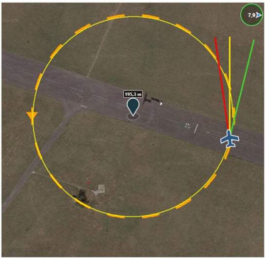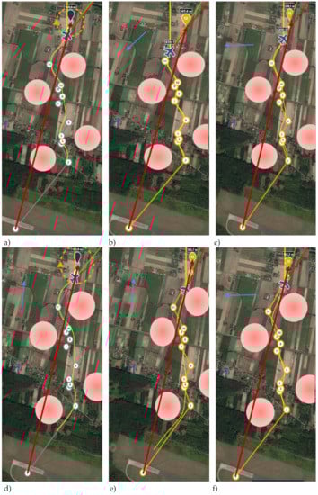 Figure 19 shows results of simulations performed in hardware-in-the-loop tests of route planning and control algorithms described above. For the clarity, only UAV flights on one of the route segments of the designated route were considered. For each segment, as shown in the description of the route planning method, the points through which the UAV must fly in order to avoid obstacles are identified. Figure 19 has six subfigures (Figure 19a–f). Each simulation was performed for the same flight path. The variable values were wind direction parameters (blue arrow; no arrow means no wind) and activation in cooperation with the management algorithm and permanent shutdown of distance to heading regulator (ON/OFF). The wind speed amplitude was 8 m/s. The flight path planned by the operator using GCS and HMI consisted in this case of two points (WPT1 and WPT8 as shown in Figure 18) and the flight path was to be a straight line (red arrow). Due to the obstacles on the route segment between WPT1 and WPT8 (see Figure 18), MC modified the flight path to 13 points, shown in the figures, based on the trajectory determination algorithms described above.