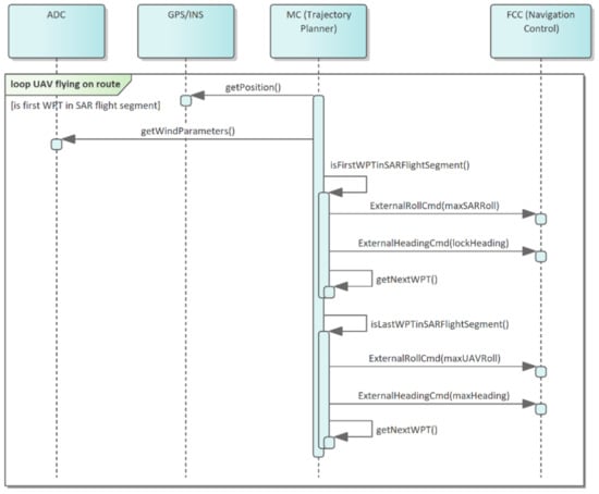The integration of FCC and MC may involve the exchange of information of two types. First, the MC may send a correction of the mission plan to the FCC when the MC’s analyses show that, as a result of changes in weather conditions, the UAV is unable to perform the task within the time frame set. In such a case, MC modules set out a mission correction by solving VRPTW optimization tasks shown, for example, in [15] or [16]. The second type of integration is the impact on the current FCC control in order to run a certain behavior of the aerial vehicle. For example, in order to correctly scan the area using SAR radar, it is important that the UAV does not exceed the maximum roll angle in spite of desired path, as described in [16]. In this case, FCC mechanisms must respond to MC control signals and block the operation of the standard controller, as shown in the article.