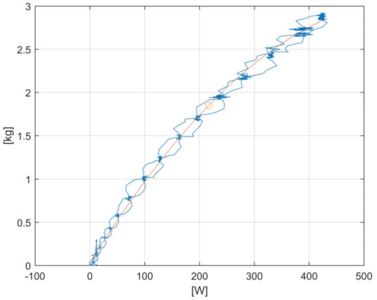 Constraints (46) and (47) help to linearize a nonlinear function modeling UAV energy consumption according to velocity. Since the platform, after exceeding a certain IAS velocity (marked in the model as ), the vehicle consumes significantly more energy; there are two inequalities (49) and (50) in the model which model this fact ( coefficients are selected depending on the type and power of the engine). Usually only in specific cases will the solver increase velocity above . This will only be the case if a point with a high profit has to be reached under conditions of strong winds from the opposite direction. The constraint (51) supports an optimization engine in setting a zero energy consumption value for the section not traveled by the UAV. Constraints (46)–(48) help to indicate the speed range in which the UAV operates. The article presents the simulation results for one selected route segment so that the results are easy for the reader to analyze.
