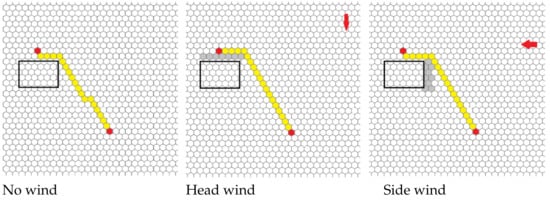 The route planning task for a UAV consists of finding a best route subject to wind direction and speed, as reflected by task constraints (42)–(51). The introduction of these constraints makes the entire MILP task a model with constraints in quadratic functions. Constraint (45) binding GS and IAS speeds is particularly problematic. It requires linearity between one or more variables (for CPLEX). In ongoing studies, the IAS functions are linearized using CPLEX. In practical applications using a Jetson Tegra class computers, solutions such as the CBC solver from the Coin-OR package may be used. Examples of algorithm performance results for different wind speeds are shown in Figure 18.