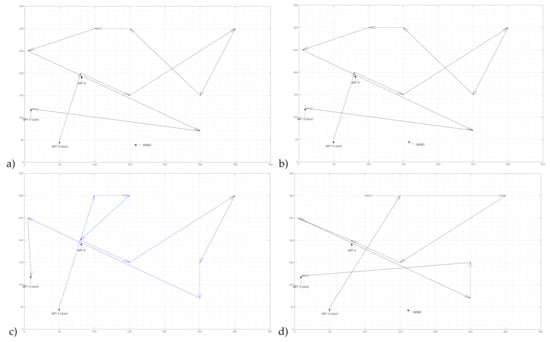 Examples of UAV flight routes for different reconnaissance priorities for objects and different wind forces. (a,b,d) Eastern wind of varying speed. (c) No wind.
