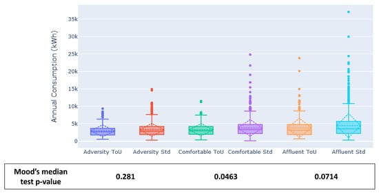 In relation to the overall consumption, under the null hypothesis that the median of annual consumption distributions are similar between Std and ToU consumers, we found that the differences are not significant (all have p-values which do not preclude the null hypothesis, i.e., for all groups) (see Figure 1). Interestingly, we found that consumers in the Affluent and Comfortable groups tend to consume more electricity than those in the Adversity group under all tariffs.
