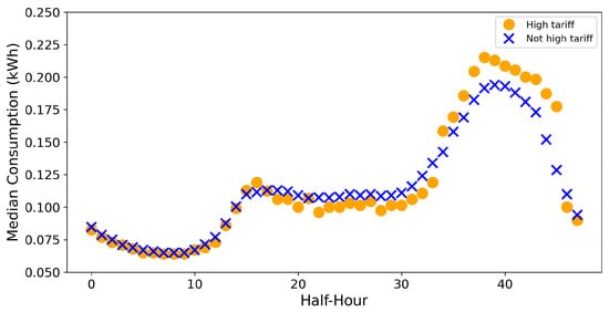 Figure 2 compares the typical consumption at high tariff times with those at non-high tariff times (the LCL data contain high tariffs with no set schedule and which may occur at all times during the day). We observed that high tariffs did not create a large consumption shift from peak to off-peak demand times. Surprisingly, we actually observed a tendency for ToU consumers to consume more during peak times when tariffs are high; however, the magnitude of this difference is relatively small, as shown in Figure 2.
