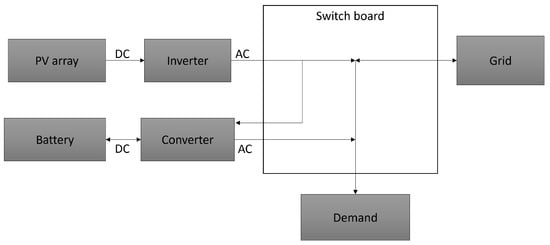 is the energy delivered by the battery to meet the demand at time t. Figure 3 illustrates how the main components of the system fit together. The battery efficiency as shown in Table 2 is the product of the inverter efficiency and the battery efficiency, each of which is assumed to be 95%. Hence the charging efficiency is and the roundtrip battery efficiency is .