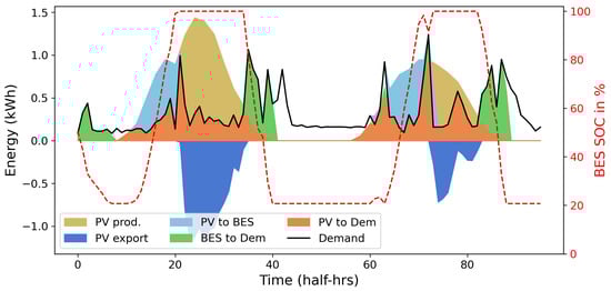 Over the course of the year, the 3.3 kWp PV system produces 3246 kWh, of which the consumer self-consumes 844 kWh and exports 1403 kWh. The battery meets 812 kWh of the consumers demand. The remainder is lost in the BES round-trip storage process. Figure 4 illustrates the demand profile for this consumer over two days and how the demand is met by generation from the PV, grid and battery.