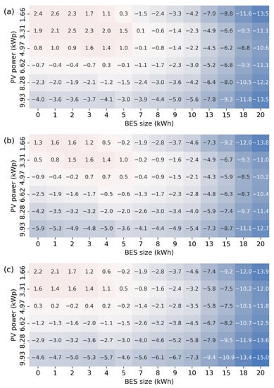 Heatmaps of NPVs (×£1000) for different PV power and BES sizes for the example consumer in the future cost scenario for all tariffs. (a) NPVs for the Agile tariff in the future scenario. (b) NPVs for the ToU tariff in the future scenario. (c) NPVs for the Std tariff in the future scenario.