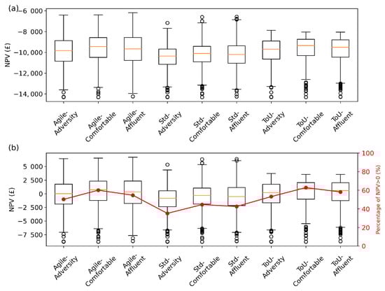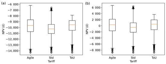Boxplots of the distribution of NPVs for the fixed PV + BES configuration for all consumers under all tariffs. (a) The NPV distributions under the baseline cost scenario. (b) The NPV distributions under the future cost scenario. The median of the distribution is shown by the horizontal line.