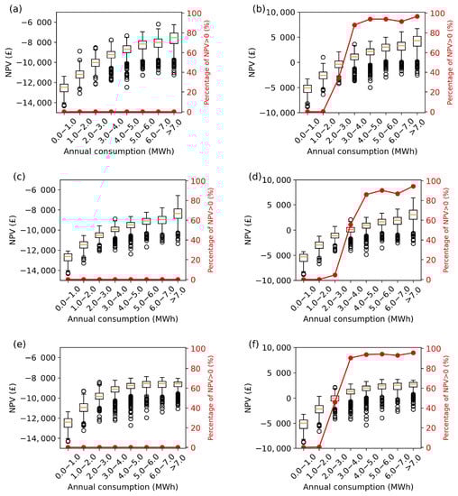 NPV distributions segregated into different annual consumption brackets for the fixed PV + BES system. (a) Agile tariff in the baseline costs scenario. (b) Agile tariff in the future costs scenario. (c) Std tariff in the baseline costs scenario. (d) Std tariff in the future costs scenario. (e) ToU tariff in the baseline costs scenario. (f) ToU tariff in the future costs scenario. The red line illustrates the percentage of consumers within the consumption bracket with NPV .
