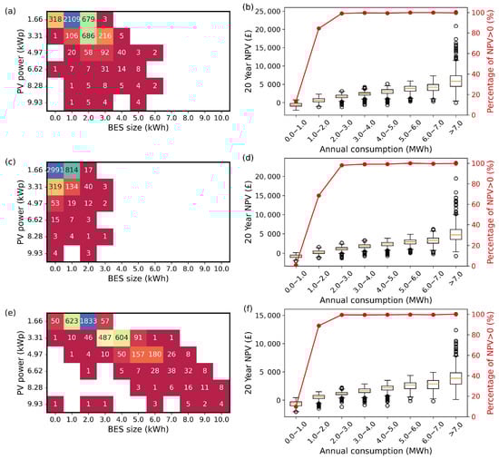 Future costs scenario results. (a) Optimum PV and battery sizes for the future Agile tariff. (b) NPV of optimum PV + BES system by consumption for future Agile tariff. (c) Optimum PV and battery sizes for the future Std tariff. (d) NPV of optimum PV + BES system by consumption for future Std tariff. (e) Optimum PV and battery sizes for the future ToU tariff. (f) NPV of optimum PV + BES system by consumption for future ToU tariff.