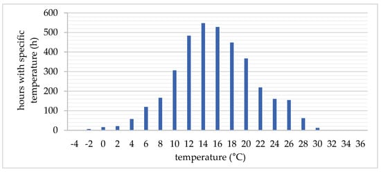 Histogram of the external air temperature distribution for the period of May from September according to the data by the typical meteorological year.