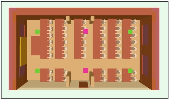 Visualized digital model: full room and the mechanical air conditioning system (green—air diffusers in the ceiling, pink—air uptake inlets in the ceiling).