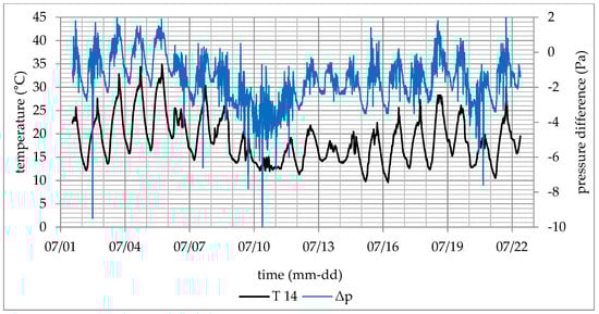 Figure 6 presents the external air temperature and the pressure difference between the room and the environment. The measuring time step was 15 min. In the examined period, the external air temperature varied in the range of 10–35 °C. It is clearly visible that the month is divided into the following three periods: the first, the warmest period (1–7 July); the second, the colder period (8–15 July); and the last warming, the last period (16–22 July). Night cooling of the air, reaching down to 10 °C, is visible. The maximum daily temperature differences occurred in the hottest period and reached 18 °C. Pressure difference measurements reveal that the room was in an under-pressure condition for almost the whole examined period. The overpressure conditions occurred only on the hottest days during the warmest period. The described situation was conducive to the infiltration of air exchange in the room.