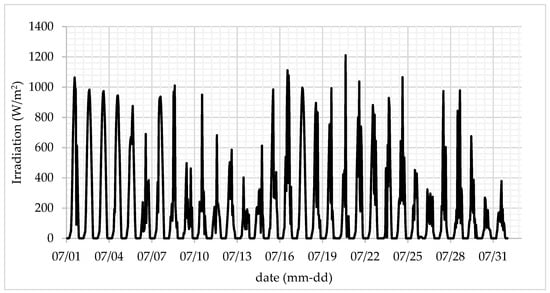 Figure 7 shows the values of solar radiation measured by the pyranometer Kipp & Zonnen CMP3. The measuring time step was 1 h. It can be slightly seen that the lower temperature in the period 8–15 July (presented in Figure 6) is correlated with less solar radiation. The highest irradiation peeks (around 1000 W/m2 and even more) were achieved before 8 July and after 15 July.