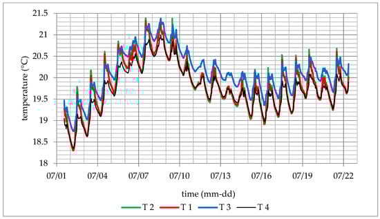 Figure 8 presents the measured values of the internal air temperature in the room as measured by sensors located in the back (southern-east orientation) and middle part of the room (sensors: T1–T4). The measuring time step was 15 min. The air temperature in the room during the examined period fluctuated in the range of 18.3–21.4 °C and was related to the external air temperature. It is worth noticing that the temperature measured by the sensors located in the back of the room, SE orientation was slightly higher. This is related to the less shading and, thus, to the greater solar insolation of the façade.