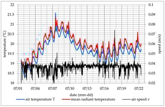 Figure 9 presents the values of air temperature and speed and ambient temperature (sensor: T, Tr, V). The measuring time step was 15 min. The measurements were carried out in an empty room; therefore, the air temperature and ambient temperature were similar, with a delicate indication of a higher ambient temperature. This might be related to solar radiation and the heating of the room equipment. Airspeed is in the range of 0.020–0.045 m/s, occasionally with peaks up to 0.05 m/s. The predominant values of the airspeed were around 0.038 m/s.