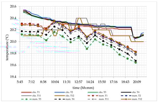 The mean temperature value obtained in the experimental research is 20.32 °C, while in the digital research, the value is 20.09 °C. As for the experimental studies (most points, excluding the area in the vicinity of the board), there is a small downfall trend (about 0.5 °C) visible in the analyzed time. The trend has been confirmed by the simulation results, and the digital model maps the reality reliably enough, and it may serve as a basis to verify some interesting factors as well as analyze some hypothetical options.