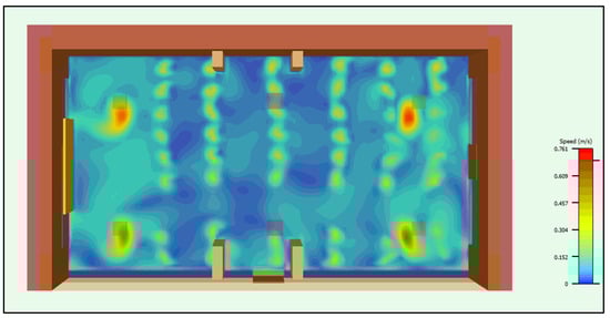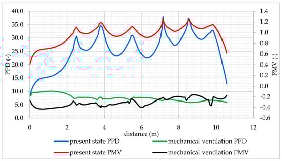 The temperature distribution presented in Figure 10 that oscillates around 20 °C in the analyzed time may suggest some favorable thermal conditions in the room. However, it should be remembered that the measurements have been taken while the room is empty. Introducing people to the room significantly increases the amount of sensible and latent heat in it. To verify conditions in the room full of its users, the initial calculation model has been supplemented with 46 people sitting on the benches in the room. Every person releases about 85 W of sensible heat into the environment. The above modification has entailed an increase of the temperature in the room by about 10 °C. The mean value for the internal temperature was circa 29.9 °C. The mean PMV coefficient for the whole room is to be at the level of about 1.2, and the PPD coefficient is to be about 35. The studies of the above coefficients have been carried out upon assuming that the metabolism is 58 W/m2 and an average person is wearing trousers, a shirt, and a jacket (0.96 clo).