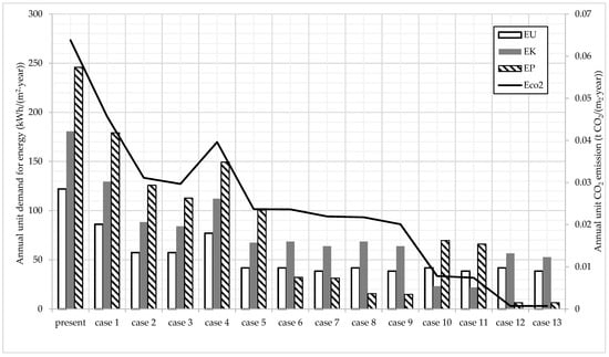 Activities aimed at energy saving of university facilities may also include diametrical changes in the heating and ventilation systems. Theoretically, a huge number of technical solutions are available. In practice, considering the financial constraints and the possibility of introducing a large number of objects to a territorially extensive campus, only a few examples of solutions were considered in terms of energy (Table 2). First, based on the results of numerical tests, it is necessary to use mechanical ventilation to maintain appropriate comfort conditions for users. This is why the use of air handling units with recuperation efficiency of about 95% was assumed (cases 5–13). For an insulated building with the replaced window joinery and lighting and mechanical ventilation (case 5), the EP dropped by 59% compared to the initial level. Additionally, the use of an air-ground heat exchanger was assumed (cases: 7, 9, 11, and 13). Fortunately, the park nature of the UWM campus provides that this solution is possible to implement for most facilities, at least in the option of a tubular device. The efficiency of this solution was assumed to be 70% based on experimental studies [70]. For cases 6–11, the change of the network heat source from coal-fired to district heating from cogeneration using biomass was considered. The usefulness of biomass under UWM conditions was emphasized in the work of Górecki et al. [71]. Moreover, in cases 8, 9, 12, and 13, a photovoltaic panel located near the object was considered a source of electricity for heating and ventilation devices.