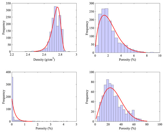 Figure 3. Basic physical properties of full diameter cores. The red line is the fitting curve of the Weibull distribution.