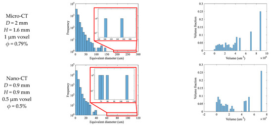 Figure 6 gives the distribution characteristics of pores, vugs, and fractures in cores of different scales. For the sample with a core diameter of 75 mm, the CT test resolution is 75 μm, which can identify the collocation relationship between vugs, fractures, and large pores. Most pores of this sample have equivalent pore diameters less than 2 mm, and a small number of pores with equivalent diameters between 2 mm and 20 mm. The maximum pore equivalent diameter is 15.55 mm. The volume of large vugs with the maximum equivalent diameter of 15.55 mm and 15.32 mm accounts for the largest proportion, although the number of vugs is small. For the sample with a core diameter of 45 mm, the CT test resolution is 45 μm. Most pores of this sample have an equivalent pore diameter of less than 1.2 mm, and a small number of pores with an equivalent diameter between 1.2 mm and 8 mm. The maximum equivalent diameter is 6.81mm, and the volume share is also the largest. For the sample with a core diameter of 13mm, the CT test resolution is 13 μm. Most pores have equivalent pore diameters less than 500 μm, and a small number of pores with equivalent diameters between 500 μm and 4000 μm. The maximum equivalent diameter is 3.72 mm. The volume share of pores with equivalent diameters of 3.68 mm and 3.72 mm is the largest, although the number of corresponding pores is small. For the sample with a core diameter of 2 mm, the CT test resolution is 1 μm. All pores have equivalent pore diameters less than 2 mm. There are only pores, no fractures, and cavities. Most of the equivalent diameters are less than 50 μm, and a small number of pores with equivalent diameters between 50~300 m. The maximum equivalent diameter is 256 μm. The largest proportion of pore volume has 202 μm and 256 μm equivalent diameters. For the sample with a core diameter of 0.9 mm, the resolution of the CT test is 0.5 μm. All pores have equivalent diameters less than 2 mm. There are only pores and no fracture and cavity. Most pores have an equivalent diameter of less than 20 μm, and a small number of pores with equivalent diameters between 20 μm~120 μm. The maximum equivalent diameter is 110 μm, and the volume share is also the largest. The number of small pores is the majority, much more than the number of large pores in terms of quantity. In terms of volume, the volume share of large-diameter pores is much larger than that of small pores. With the decrease in core size, the diameter and porosity of pores, vugs, and fractures are decreasing.