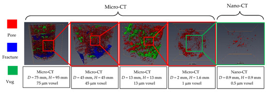 Figure 7. Spatial distribution of pores and cavities in representative cores at different scales (red indicates pores, blue indicates fractures, green indicates cavities).