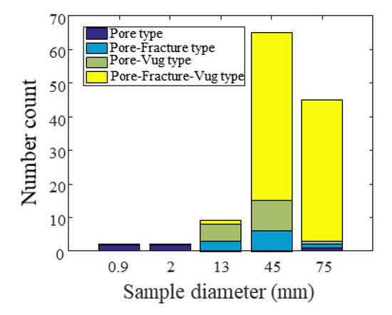 Conventional reservoir type classification is mainly based on conventional logs, imaging logs, and well-test curves. However, these tools mainly use distribution curves to indirectly reflect the development of pores, vugs, and fractures in the reservoir and fail to quantitatively portray the degree of their development and collocation relationship among those structures. Therefore, the classification results are somewhat subjective. We use the vug–fracture identification technology to classify the reservoir types of carbonate gas reservoirs and use the CT data as the basis for the development of vug-fracture in reservoir cores. Referring to the national standard “Classification of Natural Gas Reservoirs: GB/T26979-2011”, the reservoir is classified into four types: pore type, pore–fracture type, pore–vug type, and pore–vug–fracture type. The physical parameters of the cores obtained from Lamp Four Group Moxi 126 well were counted according to the four reservoir type classification criteria (Table 1). Figure 8 gives the statistics of the number of core structure types at different scales. When the core diameter is 0.9 and 2 mm, all core structure types are pore types; when the core diameter is 13 mm, 55% of the core structure types are pore–vug types; when the core diameter is 45 mm, 78% of the core structure types are pore–vug–fracture type; when the core diameter is 75 mm, 93% of the core structure types are pore–vug–fracture type.