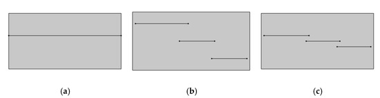 How can natural gas be produced consistently and steadily when the carbonate matrix is dense and the poorly connected pore–vug–fracture network? Matthäi and Belayneh [31] investigated the impact of the geometric arrangement of constant-opening fractures on the effective permeability. We built a numerical model based on it, with a model size of 100 × 500 mm2, as shown in Figure 9. The matrix permeability is 0.1 mD, and the fracture opening is 0.1 mm, satisfying the cubic law. The efficient permeability for the three working conditions is 0.51 mD, 0.25 mD, and 0.35 mD, respectively. The cracks in Figure 9c are not interconnected, but the efficient permeability is only 31% less than the fully penetrated case (a). This result indicates that (1) poorly connected fractures can significantly increase the permeability, and (2) fracture aggregation can increase the efficient permeability because it reduces flow distance through the less permeable matrix.
