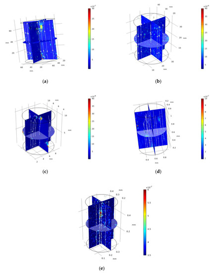 A 1.5 MPa pore pressure is applied at the bottom boundary, 1 atm pore pressure is applied at the upper boundary, and the side surface is impermeable. The pore–vug–fracture structure distribution in the numerical model is given in Figure 11. The Darcy velocity distribution of the specimen is obtained by simulation. Figure 12 gives the distribution of Darcy velocity along with the multiple internal slices of the carbonate rock sample. The influence of the pore–vug–fracture structure causes local preferential and disturbed flow in the core, which significantly affects the path distribution of fluid flow in the core, and the flow velocity exhibits nonuniformity. The flow lines converge toward the pore, vugs, and fractures with high flow velocity and can increase the core permeability by several orders of magnitude. The pore–vug–fracture structure constitutes a dominant flow channel, which is the key to effectively improving the permeability of the core. Under the same experimental conditions, the flow velocity decreases with the reduction of specimen size. The pore pressure distribution is given in Figure 13. Unlike the homogeneous model, the pore pressure contours are significantly nonlinear. Since the heterogeneity of specimen porosity and permeability is considered by digital image processing, the unit permeability and porosity are the same. The larger the porosity, the larger the permeability. Therefore, the overall permeability of the specimen is a comprehensive reflection of the permeability of many microelements in the specimen. The specimen permeability can be back-calculated by the area integral for the flow rate at the top of the specimen. Table 3 compares the core permeability calculation results and the experimental results, which are in good agreement.