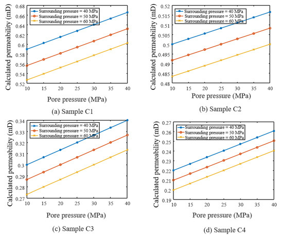 Figure 14. Variation curve of permeability with pore pressure and surrounding pressure (a) Sample C1, (b) Sample C2, (c) Sample C3, (d) Sample C4.