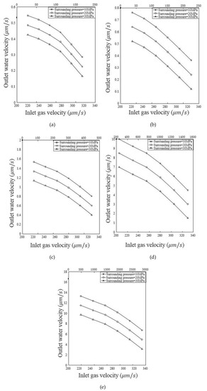 Next, we consider the case of equal inlet water and gas pressure, i.e., pw = pg. Figure 16 shows the variation in water and gas outlet velocity with inlet gas pressure. The specimen is first saturated with water at a given inlet water pressure. Then start injecting gas and make the inlet gas pressure equal to the inlet water pressure. Measure the gas and water flow rate after a steady state. Under a prescribed surrounding pressure, the two-phase outlet velocity is small with lower inlet gas and water pressure. As the inlet gas and water pressure increase, the two-phase outlet velocity increases. The outlet gas velocity is always greater than the outlet water velocity regardless of the inlet pressure. With the increase of the surrounding pressure, the two-phase outlet velocity decreases.