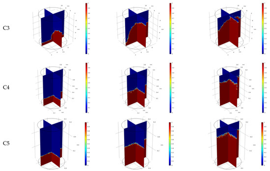 Figure 17 provides the process of the gas phase displacing the aqueous phase for different size specimens (blue for the aqueous phase, red for the natural gas phase, pc = 10 MPa, pg = 325 kP, pw = 200 kPa). It can be seen that with the increase of gas injection volume, the nonwetting phase expels the wetting phase from the porous medium with a stable displacement front. The injected gas can flow faster toward the outlet due to the influence of the pore–vug–fracture structure, causing the nonlinearity of the displacement front velocity.