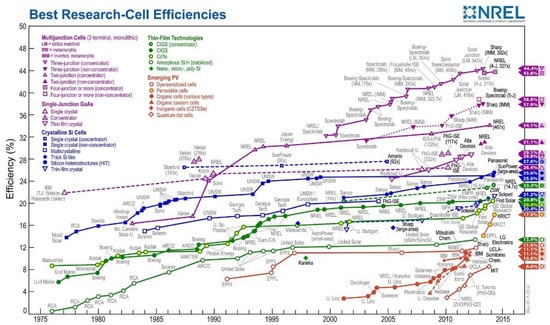 - National Renewable Energy Laboratory (NREL). Best Research-Cell Efficiencies. Available online: https://commons.wikimedia.org/wiki/File:Best_Research-Cell_Efficiencies.png (accessed on 14 April 2022).