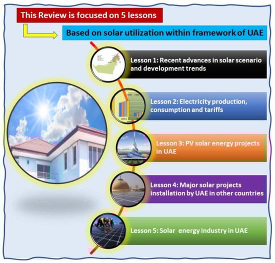 To the best of our knowledge, no detailed evaluations of solar energy resources have been published throughout the United Arab Emirates’ seven emirates. The goal of this article is to provide an in-depth examination of current solar energy research and operations in the UAE. As a result, the primary goal of this study is to expand on such basic work by addressing the following issues: 1. an outlook on the UAE, 2. the UAE’s energy portfolio, 3. electricity production, consumption, and pricing in the UAE’s seven emirates, 4. focus on the many features of PV solar installation projects within the context of the Dubai and Abu Dhabi emirates, UAE, 5. various solar projects outside of the UAE, and 6. the solar energy industry in the UAE. Finally, the review includes a summary, difficulties, current developments, and prospects. Because of higher solar exposure in the UAE, electricity can be produced (rather than coal sources) to meet the demand for population growth while also reducing environmental pollution, particularly CO2 emissions and other greenhouse gases. This review provides a great opportunity for readers who work in solar energy research in the UAE. The outline of this review is shown in Figure 3.